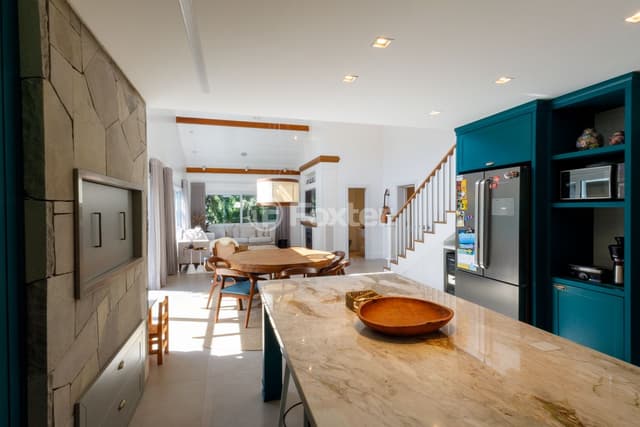 O coração desta casa pulsa em seus ambientes de estar e jantar integrados, um convite irrecusável à celebração da vida e dos bons momentos. Imagine-se em noites frias, reunido ao redor de uma lareira encantadora, cujas chamas dançantes criam um espetáculo hipnotizante, aquecendo não apenas o corpo, mas a alma. Este é o palco perfeito para jantares memoráveis, conversas que se estendem pela madrugada e risadas que ecoam em um ambiente que respira aconchego.